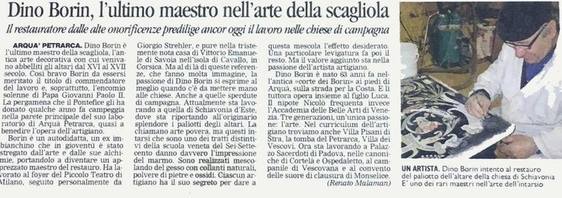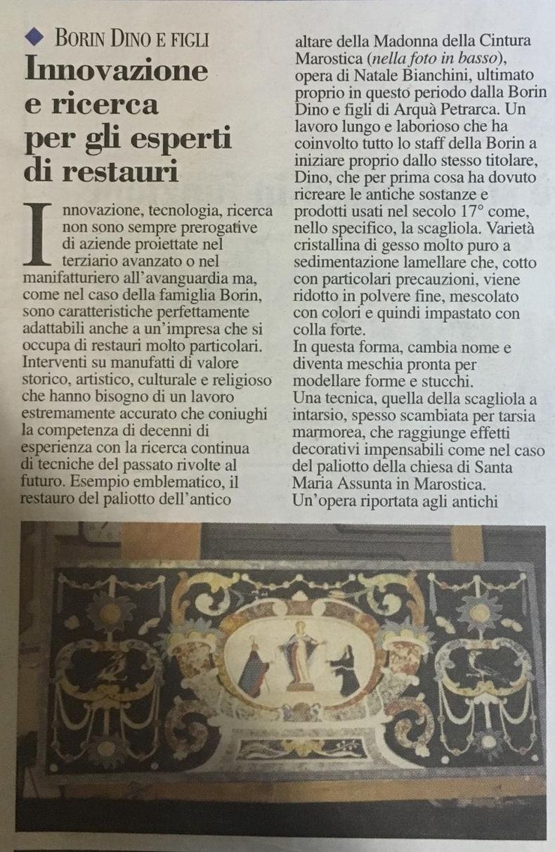 L'azienda Borin comm. Dino & Figlio, specializzata nell'ARTE DEL RESTAURO, è un’impresa di restauro attiva da oltre cinquant’anni, dedicata al recupero e al consolidamento di edifici di rilevante interesse storico. Giunta alla terza generazione, Borin comm. Dino & Figlio opera con professionalità e competenza anche su beni tutelati dalle soprintendenze, avvalendosi di un team di esperti e maestranze altamente qualificate, mosse da una profonda passione e da un profondo rispetto per l’arte. Queste peculiarità, unite a interventi di straordinaria eccellenza, hanno consentito all'azienda di emergere nel settore e di essere annoverata tra le imprese di fiducia da Diocesi, Soprintendenze locali e clienti privati.